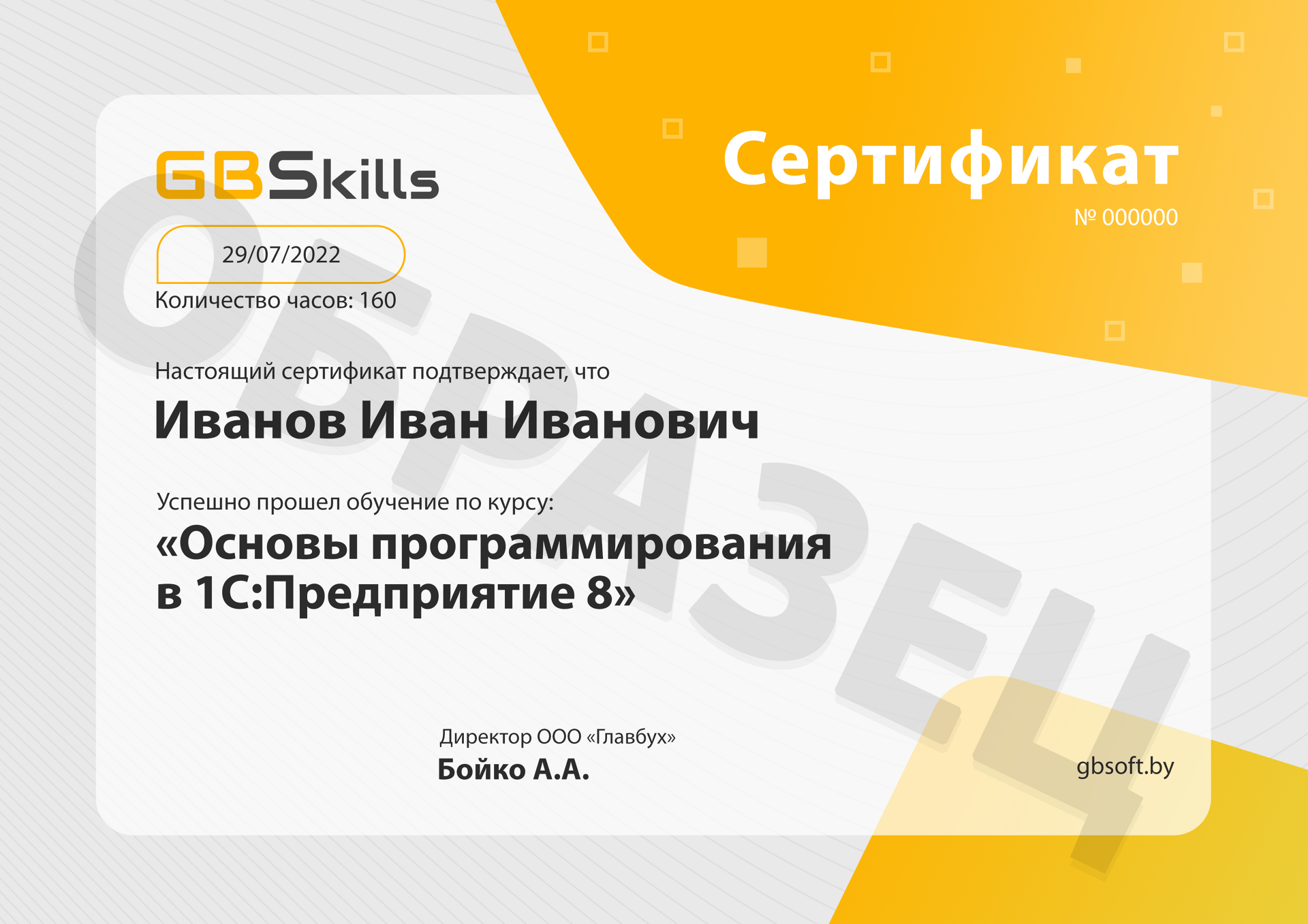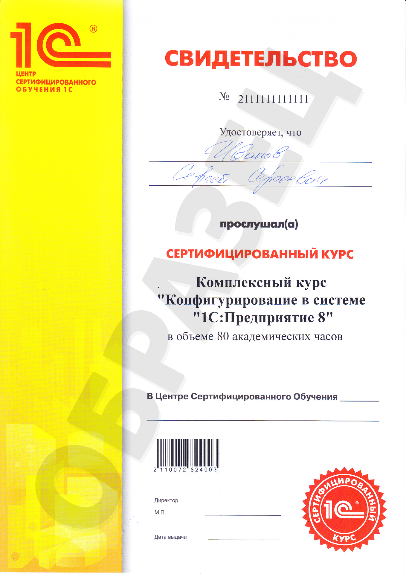 Сертификат государственного образца об обучении, свидетельство 1С, подтверждающее ваше успешное прохождение курса, которое можно прикрепить к вашему резюме или предоставить работодателю, а также сертификат нашего учебного центра об окончании курса